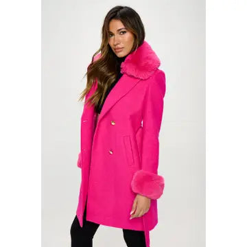 Make a luxurious statement in our Faux Fur coat, where timeless elegance meets modern sophistication. This striking mid-length coat features sumptuous removable faux fur accents at the collar and cuffs, creating dramatic textural contrast against the rich jewel-toned fabric. The flattering double-breasted silhouette is enhanced with gleaming gold buttons and a coordinating self-tie belt that defines the waist.